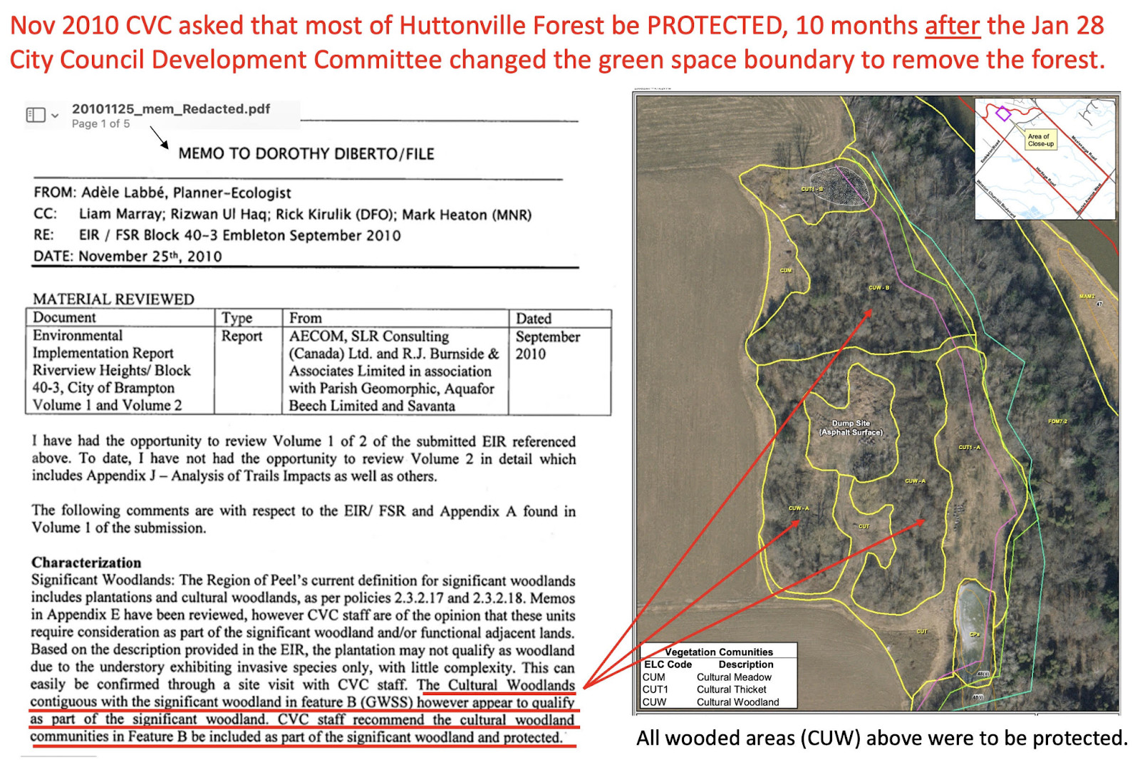 On November 25, 2010, CVC planner and ecologist at the time, Adèle Labbé (who now works as a Science Advisor at Fisheries and Oceans Canada), wrote to CVC’s then acting senior manager of Planning and Development Service, Dorothy Di Berto, advising the forest should be considered a “significant woodland” and “protected”.