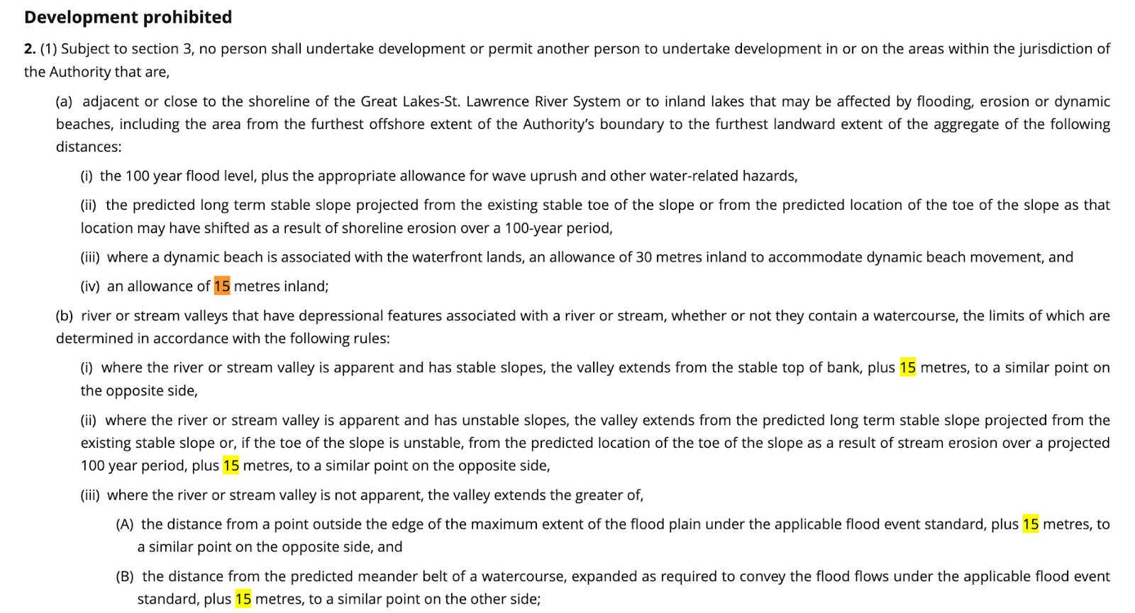 Before being revoked in 2024, Ontario’s Conservation Authorities regulations generally prohibited development within river valleys from the stable top of bank plus 15 metres and farther where slopes were unstable or projected to shift over a 100-year period. The protected area was intended to safeguard slope stability, prevent erosion and preserve ecological function along waterways.