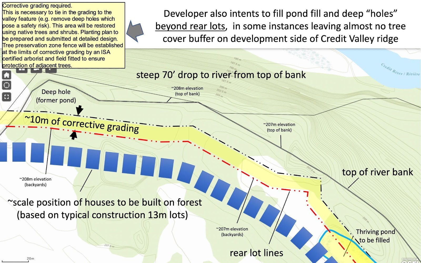 But the residents’ fight is now for what remains. A 10-metre top-of-bank buffer zone along the steep slope that descends toward the Credit River.