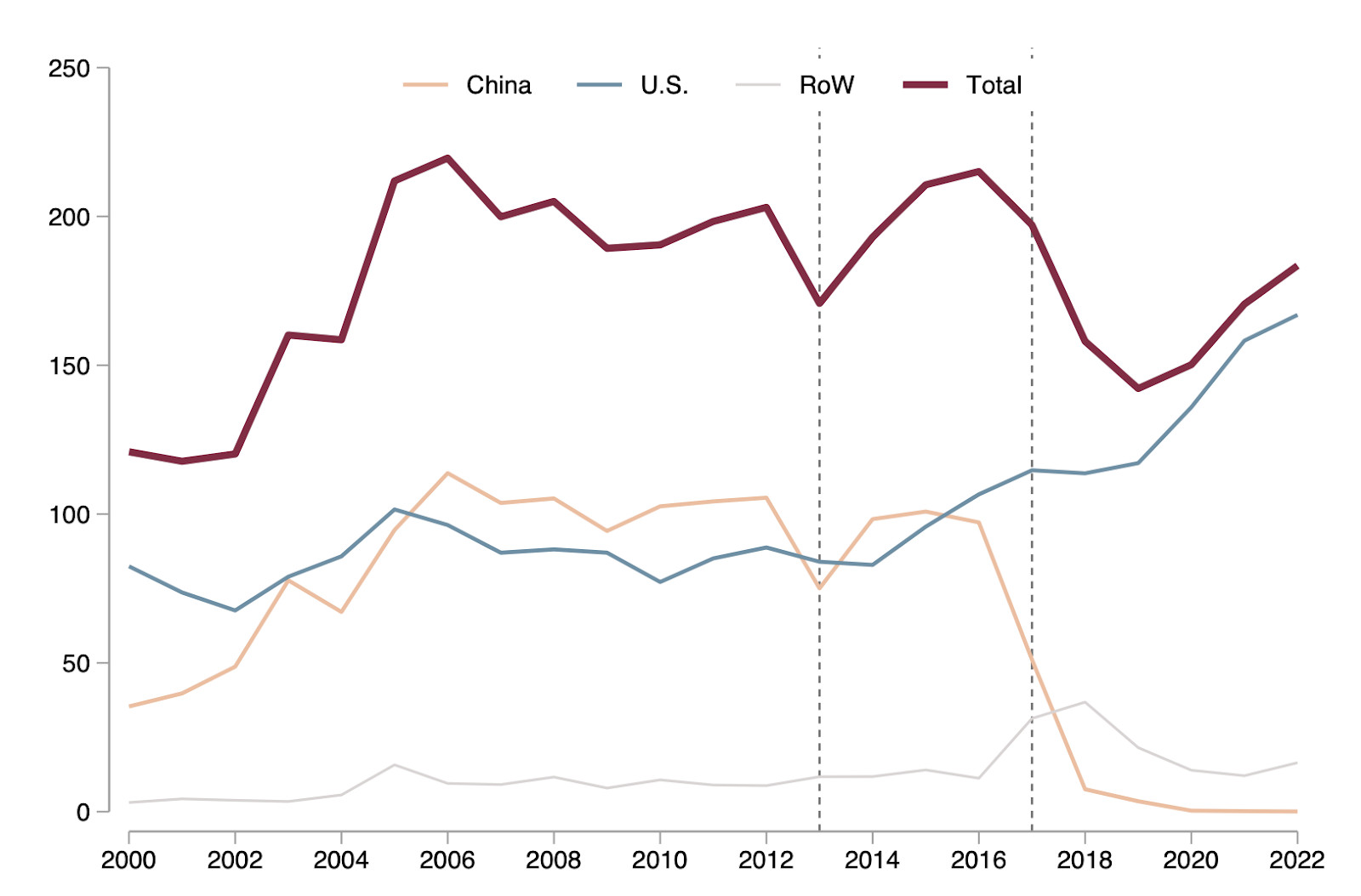 After China’s 2018 ban on plastic waste imports, Canada’s exports fell from about 210,000 tonnes before 2017 to around 150,000 tonnes between 2018 and 2020. The United States now receives 91 percent of Canadian plastic waste exports, up from less than 50 percent in 2016. Provincially, British Columbia cut exports by nearly 70 percent between 2016 and 2022 while Ontario’s exports fell about five percent. In 2019 alone, Canada exported 142,000 tonnes of plastic waste but imported 166,000 tonnes, mostly from the U.S..