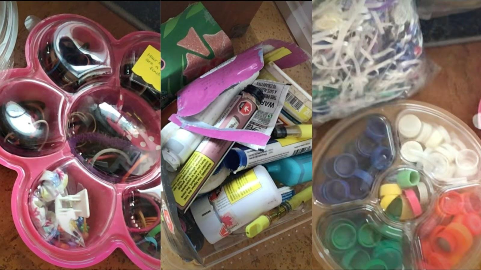 In her shed, she keeps neatly assembled bags and boxes of the garbage she collects by type and colour: bottle caps, water bottles, beer cans, sand toys, hair elastics, ​​shotgun wads, vaping containers, fishing net floats, latex balloons, ribbons and discarded toys.