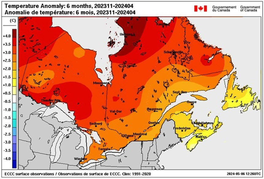 From November 2023 through March 2024, the Great Lakes region experienced significant warmth compared with historical averages. A six-month temperature anomaly showed air temperatures 2 to 2.5 degrees Celsius above normal over the southeastern lakes and 3 to 4 degrees Celsius warmer over the northwestern lakes. December through February (usually the coldest months when most ice normally forms) remained exceptionally warm, delaying ice formation and shaping what would become one of the lowest ice seasons on record.