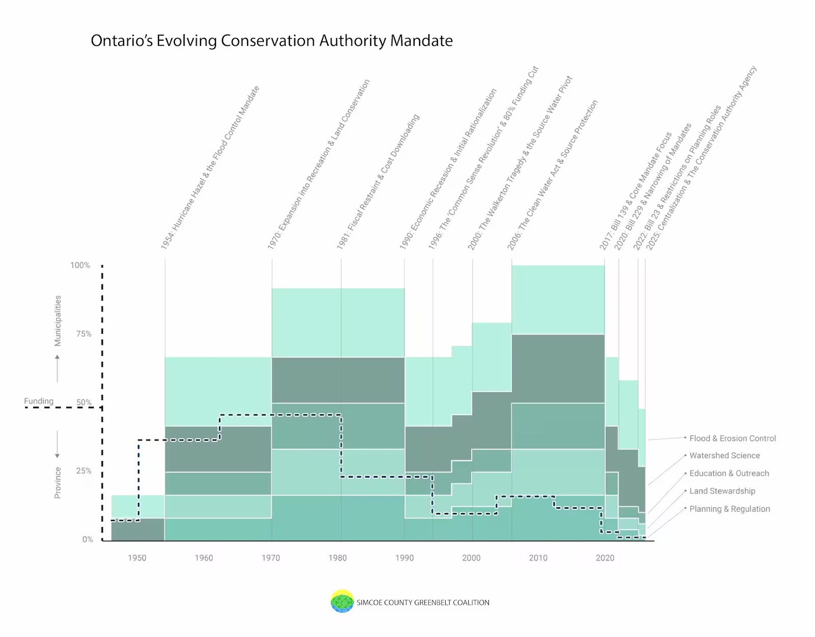 “Between 1960 and 1980, Ontario’s conservation efforts were a partnership between locally rooted conservation authorities, the municipalities participating in them, and the provincial government, with equal funding and growing responsibility. While conservation efforts reached a high in the late 2000s and 2010s, this was largely due to local initiative, with provincial funding continuing the decline toward near-zero started under the Harris government. In the past decade, both regulatory authority and funding have been cut. CAs’ area of responsibility is now at levels not seen since the 60s, and the provincial funding share has reached record, near-zero, lows,” a new report by the Simcoe County Greenbelt Coalition highlighted.