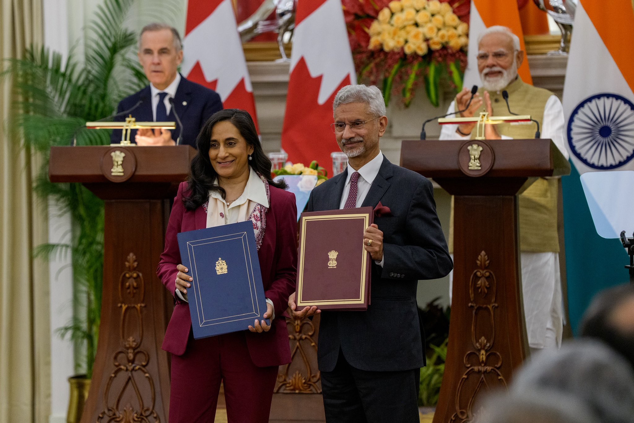 Canadian Foreign Affairs Minister Anita Anand (holding the blue document cover) in India Monday, with Prime Minister Mark Carney and his Indian counterpart Narendra Modi behind her.