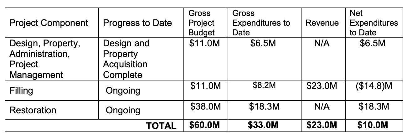In 2021, the City of Mississauga reported the Jim Tovey Conservation Area expenses totalled $33 million with $23 million offset by revenue from accepting fill, resulting in a net spend of $10 million.