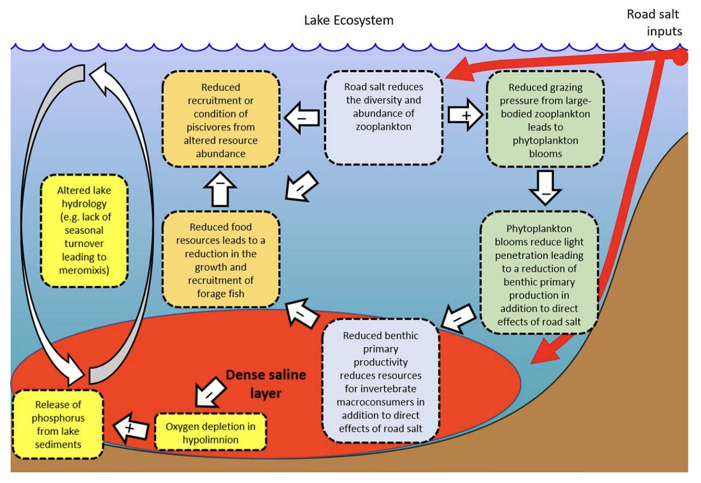 A 2018 study done by U.S.-based researchers noted that compared to rivers, streams and wetlands, relatively little is known about how road salts affect lake communities but the impacts can be severe. Chloride concentrations of 217 to 445 mg/l in natural lakes were linked to shifts in species composition, favouring salt-tolerant phytoplankton and zooplankton and reducing populations of large-bodied grazers like Daphnia. In turn, it can trigger trophic cascades, where unchecked phytoplankton growth leads to algal blooms that shade benthic organisms and reduce primary production. The added stress of fish predation, combined with elevated chloride levels (around 1,000 mg/l), can increase the mortality of native clams and zooplankton, disrupting food webs as a result. Road salt can also interact with environmental factors such as low calcium or oxygen depletion, creating dense saline layers that release phosphorus from sediments and exacerbate algal blooms. These cascading effects ripple through the ecosystem, reducing macroinvertebrate diversity, limiting fish recruitment and affecting higher-level predators, ultimately altering lake structure, function and ecosystem services.