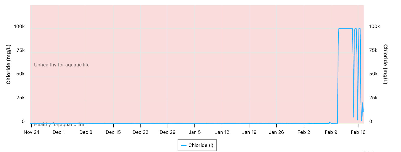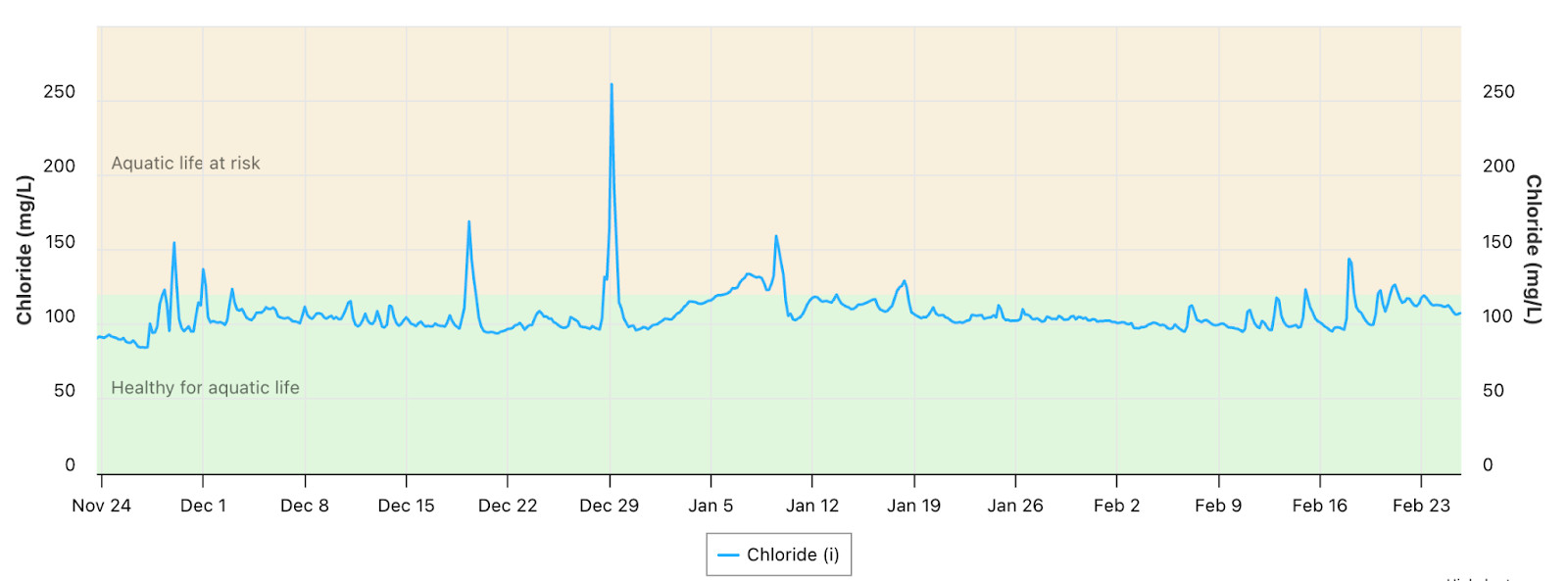 Chloride levels in Credit River at Highway 10 North have been either unhealthy or at risk for aquatic life since December.