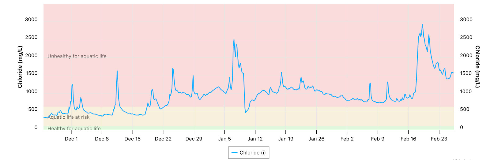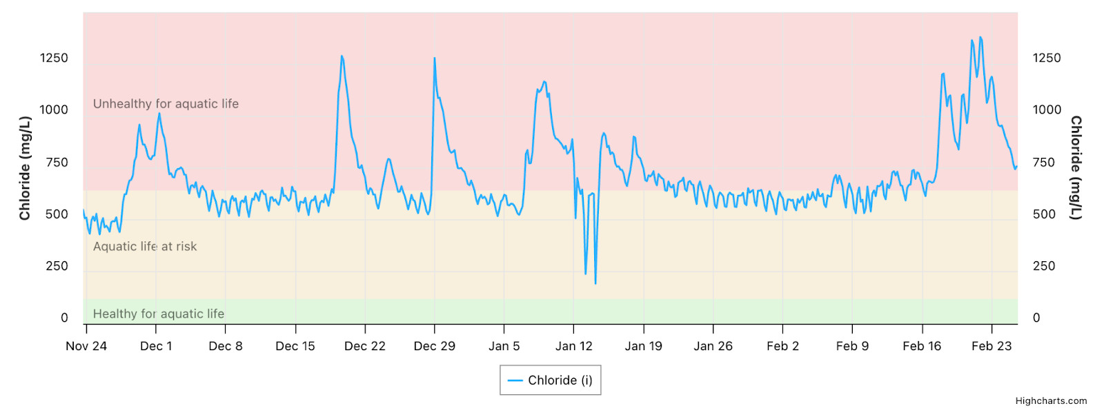 While the last recorded chloride levels at West Credit River at Belfountain Conservation Area seem to be healthy, there have been spikes in December, January and February putting aquatic life at risk.