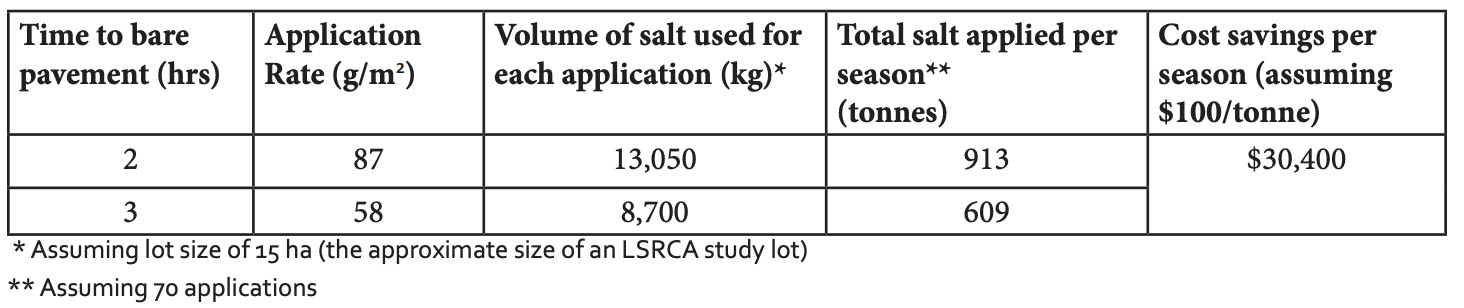 Research by Lake Simcoe Region Conservation Authority on friction testing of surfaces with snow noted “over-application of salt does not translate to safer conditions”.