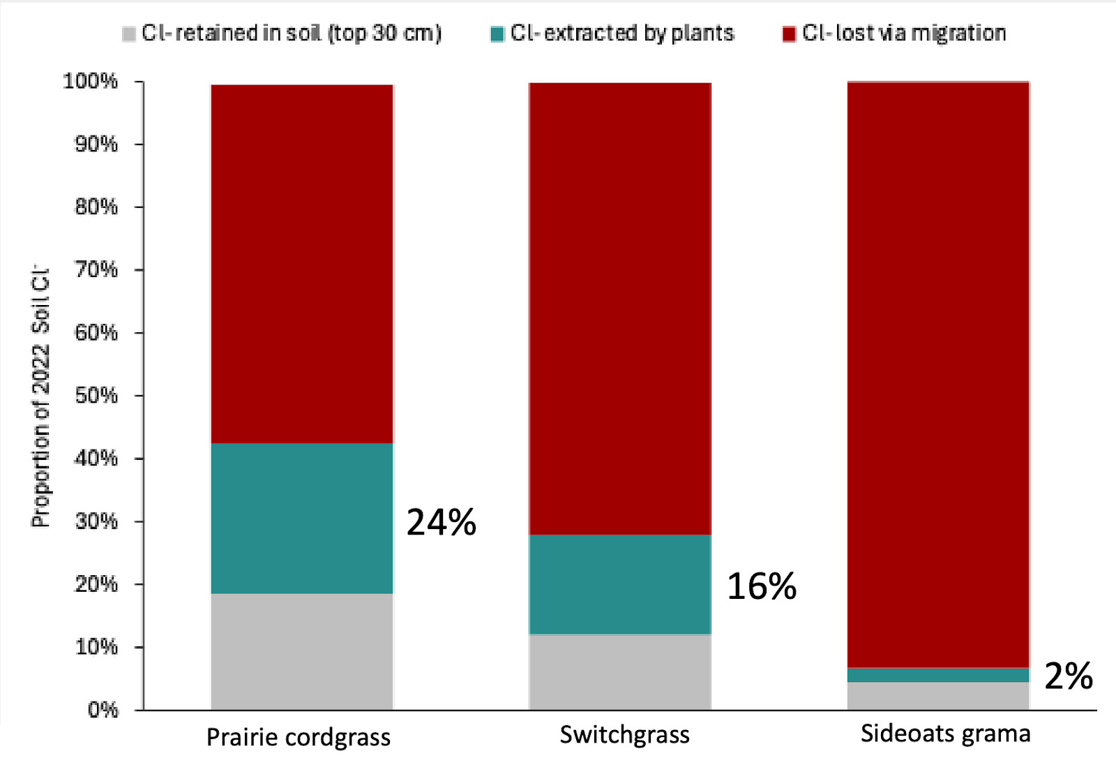 The teal bars indicate that over the first three years of the project, prairie cordgrass extracted about 24 percent of the chloride initially present in the soil in 2022. By 2024, switchgrass had removed about 16 percent, while sideoats grama extracted only about two percent. In comparison, the grey bars show that between five and 19 percent of the original chloride remained in the soil. The red bars indicate that 56 to 93 percent of the chloride either migrated deeper into the ground or moved away from the site into downstream environments.