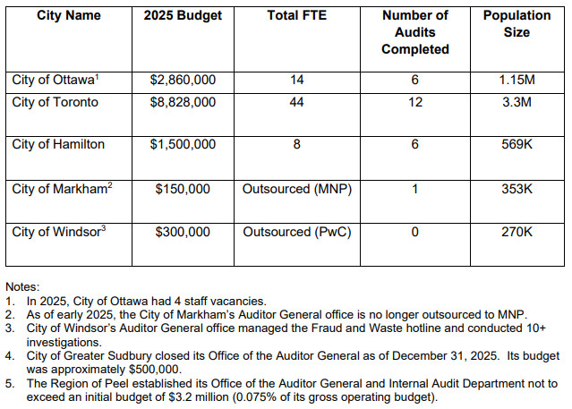 A comparison of other municipalities in Ontario who have an Auditor General, looking at costs, staffing and audits completed. This comparison was provided by City staff in their report to Council on March 4, 2026.