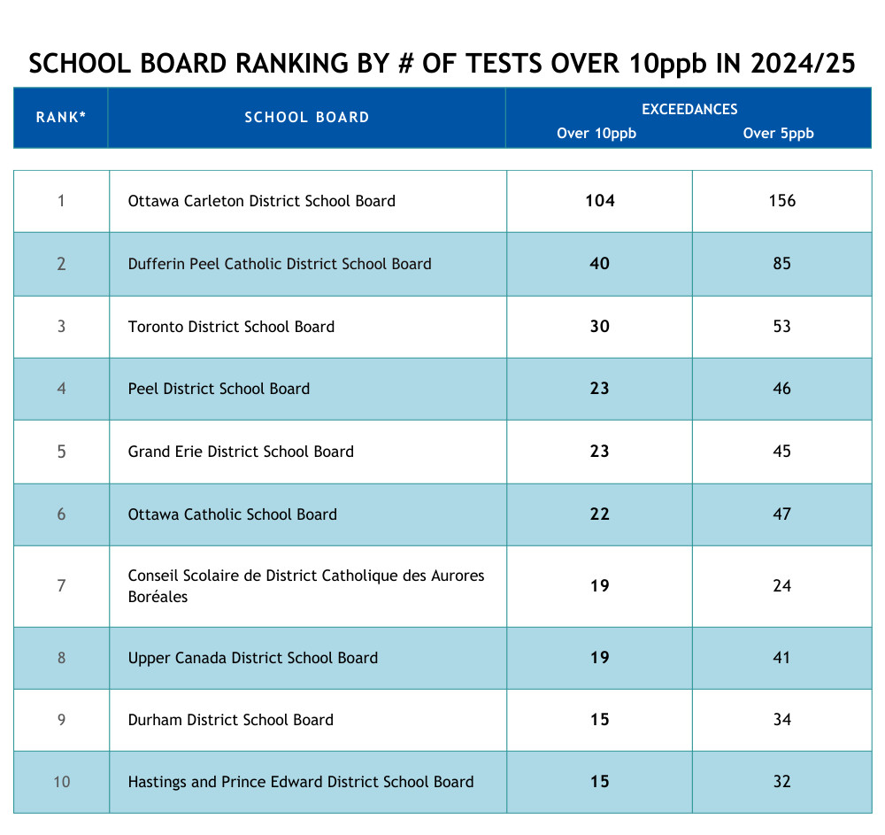 Top 10 school boards identified by the Canadian Environmental Law Association as having the highest toxic lead levels in drinking water in Ontario.