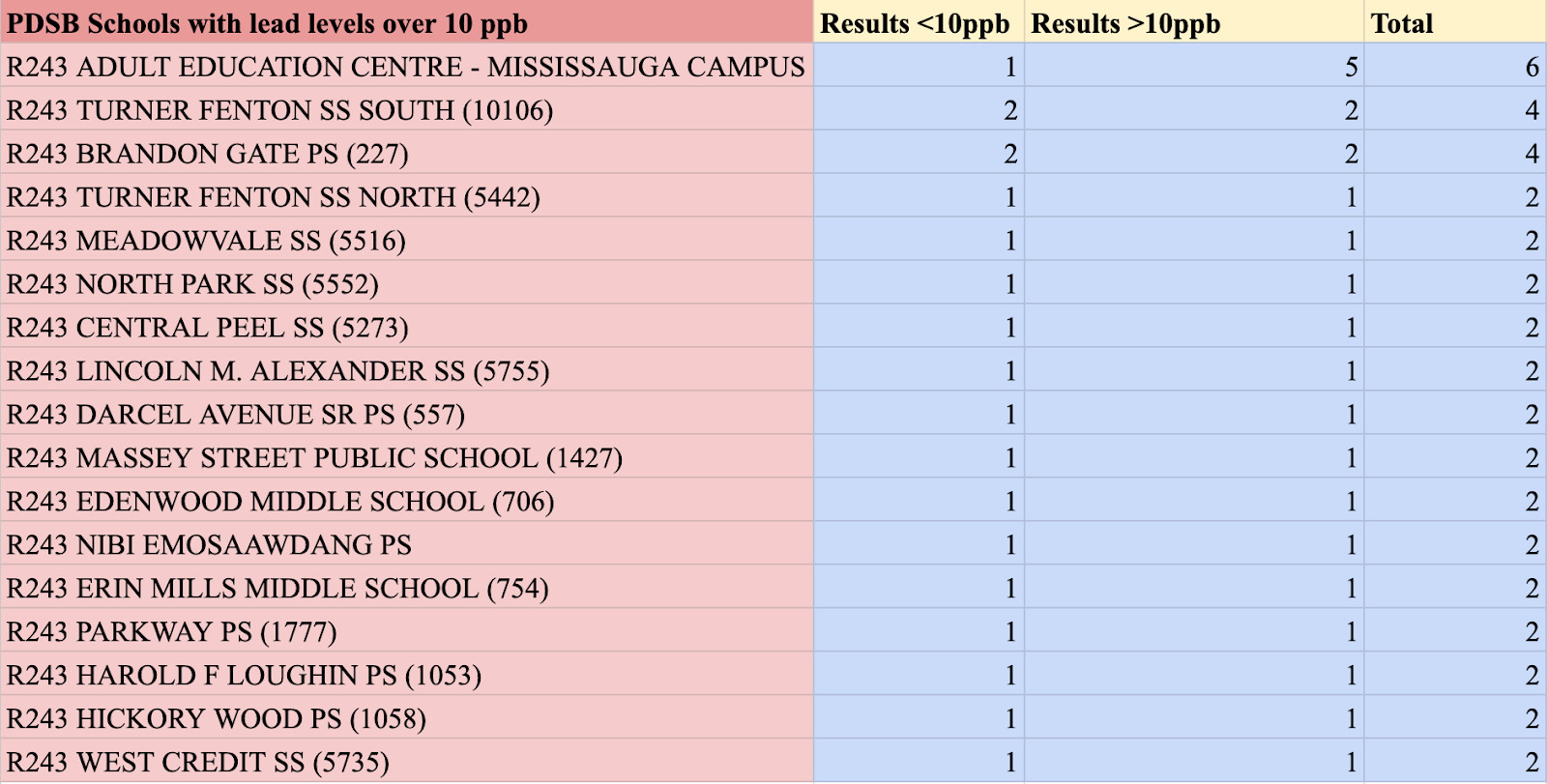 The Peel District School Boards (PDSB) institutions identified with lead levels over 10 ppb.