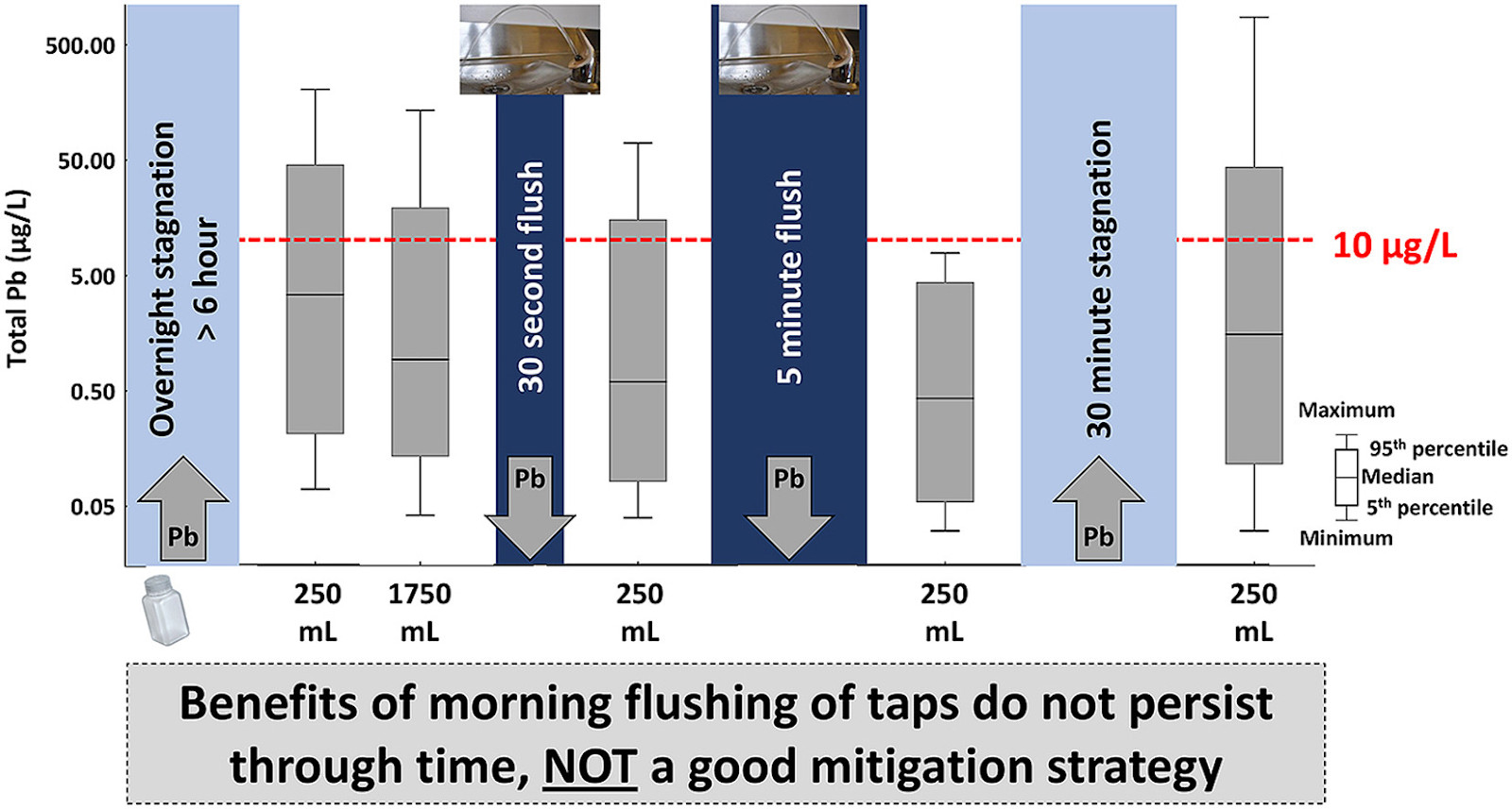 While short (30 seconds) or extended (5 minutes) flushing can reduce these levels by more than 90 percent, the benefit is short-term; after just 30 minutes of stagnation, lead concentrations can rebound to more than 45 percent of their initial high values.