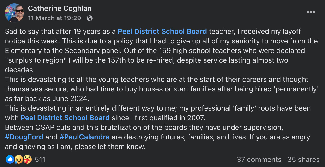 A PDSB teacher took to social media to share she was among the educators who received a layoff notice.