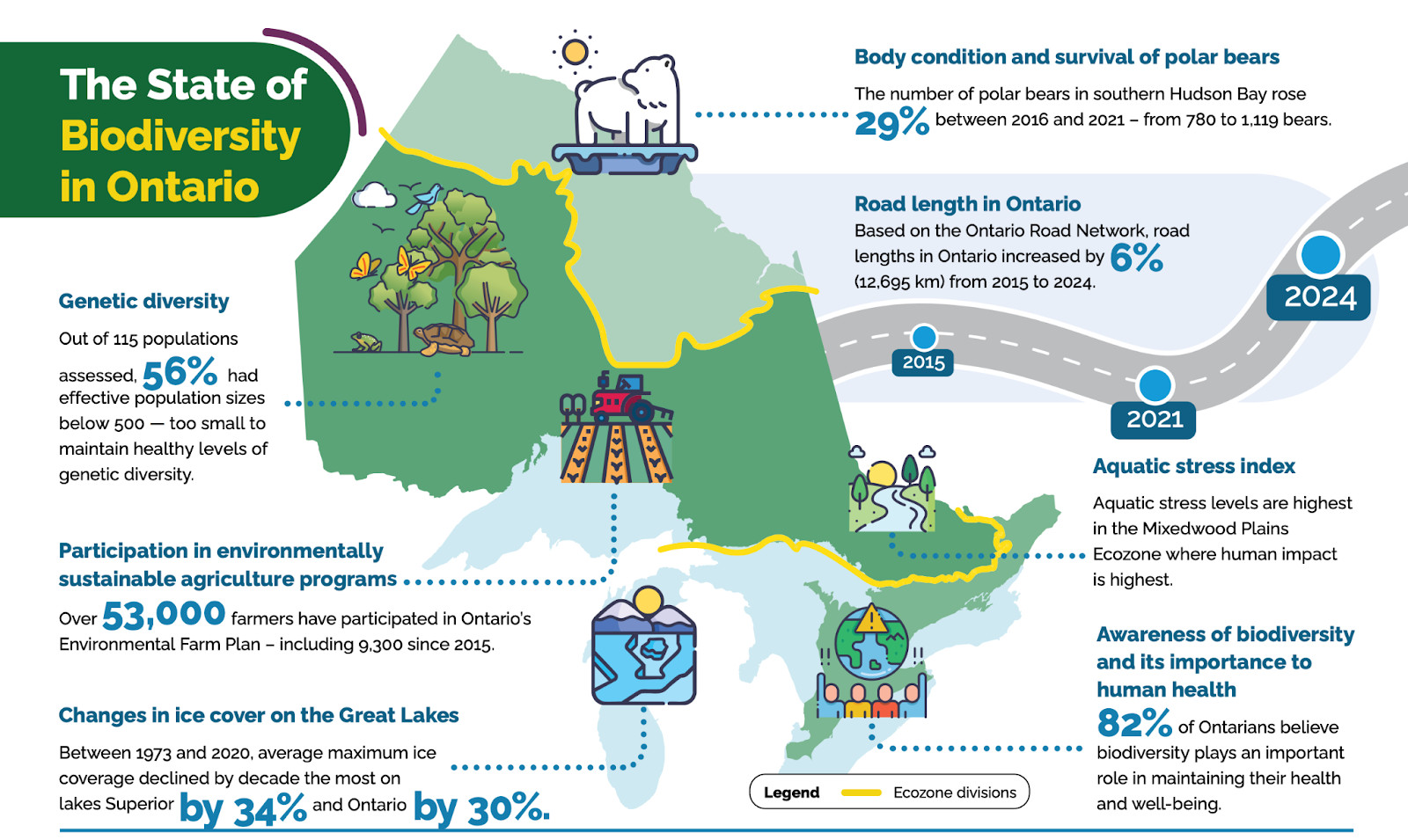 The 2025 State of Biodiversity report by Ontario Nature found between 2015 and 2024, Ontario’s road network grew by six percent (12,695 kilometres) while 56 percent of 115 assessed populations had effective population sizes below 500, too small to maintain healthy genetic diversity.
