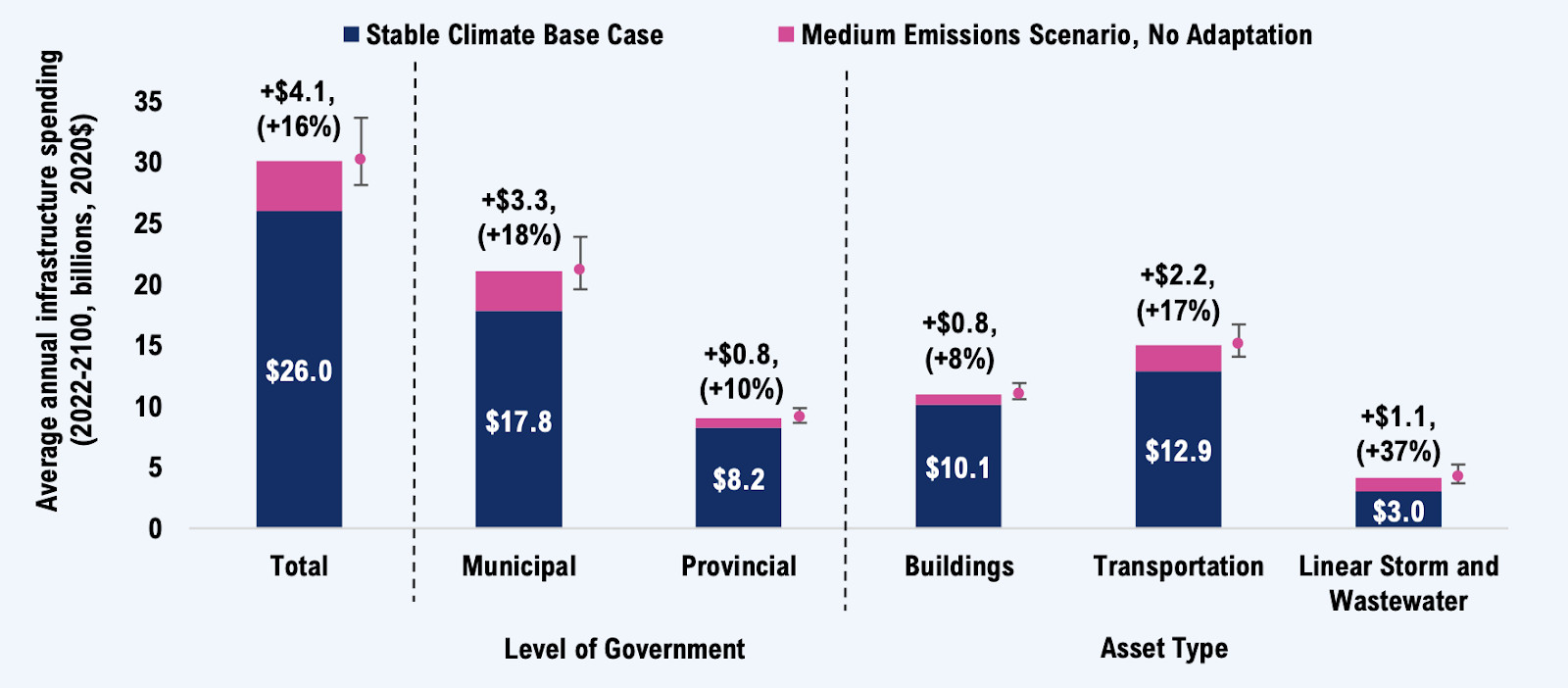 The Financial Accountability Office of Ontario warned in 2023 that without adaptation, the province could face an average increase of roughly eight percent or about $2 billion annually in public infrastructure costs for every 1 degree Celsius rise in global temperatures beyond the 0.5 degrees Celsius baseline.