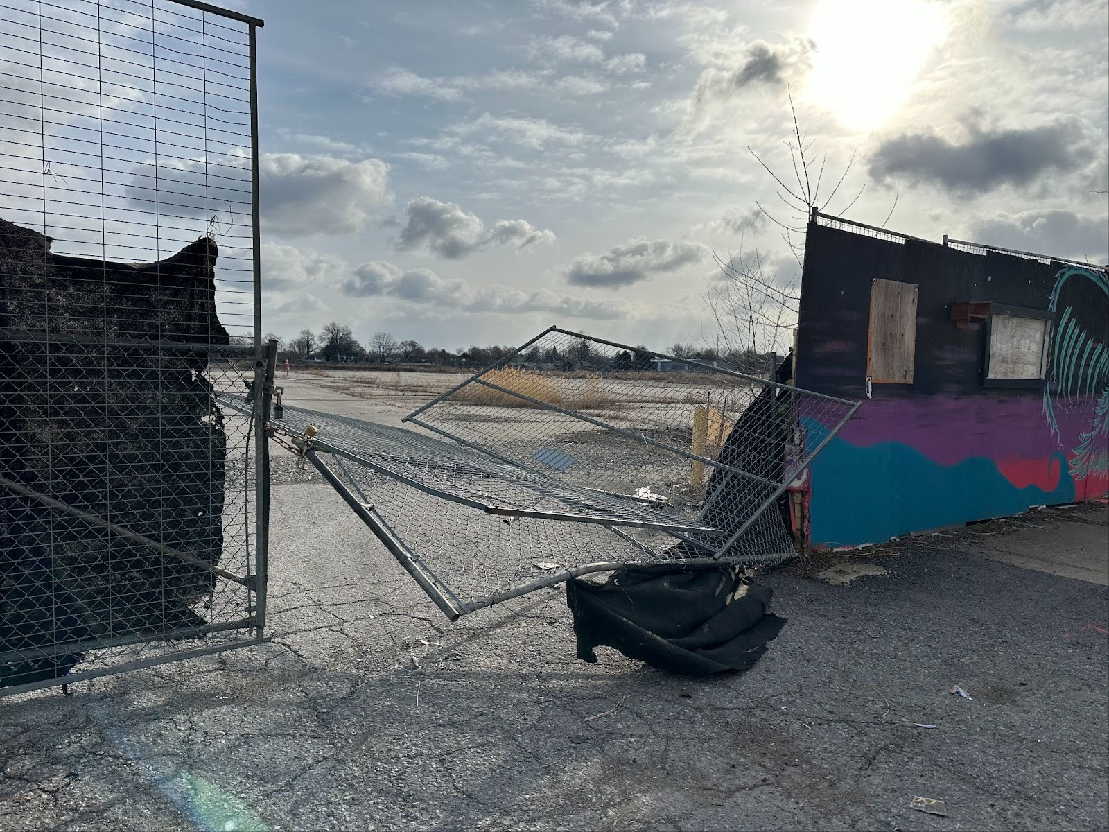 The gate to the GM site (top) pictured on March 28. Elected officials have repeatedly described the site as “secured”. For anyone who wanders through the collapsed gates, open pits, crumbling pipes and brick all pose a significant risk.