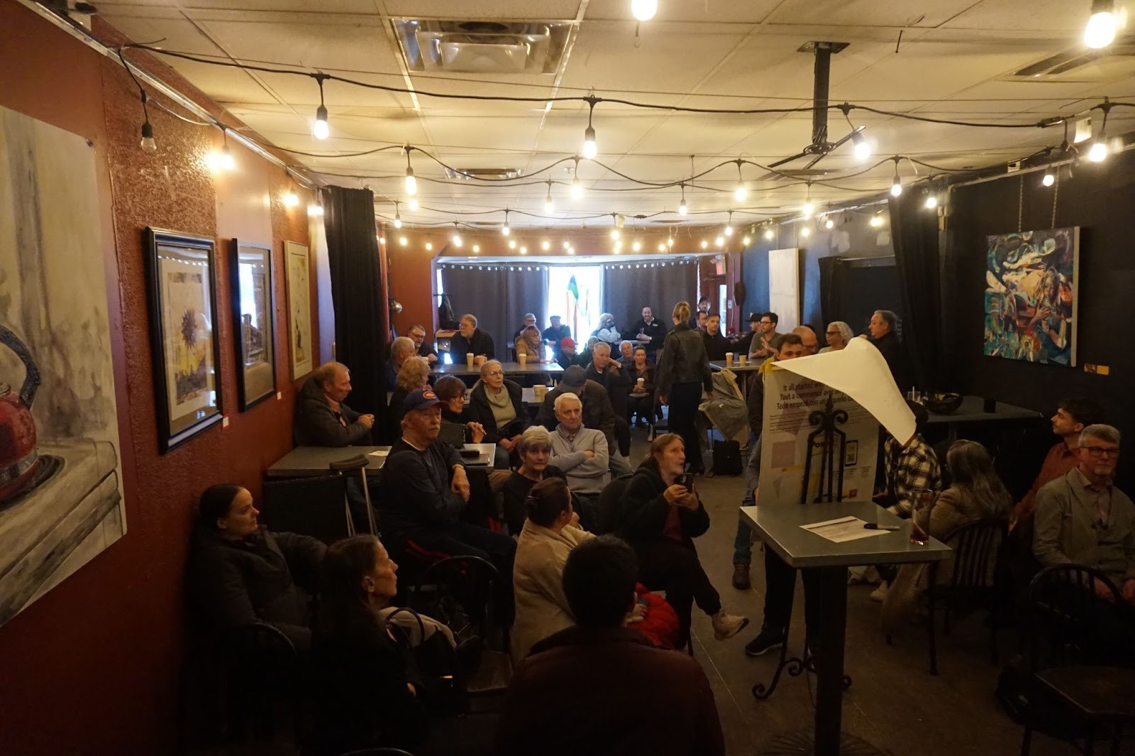 Residents gather at the Mahtay Cafe to discuss the former GM site on Saturday, March 11.
