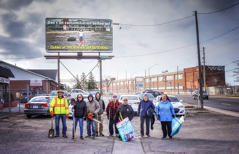The group launched an aggressive marketing campaign designed to keep the issue highly visible in the community. Most notably, it secured a prominent billboard along Ontario Street, one of the main approaches to the GM site and a major thoroughfare in the city, featuring stark, dramatic imagery of the property in its current condition alongside messaging that calls on the City to use its full authority to ensure the site is properly cleaned up.