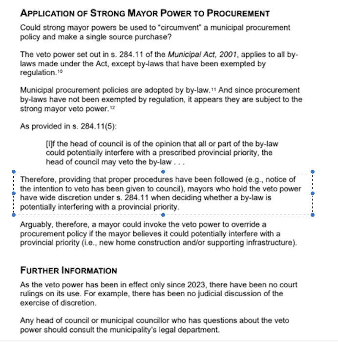 An analysis completed by Ontario’s Legislative Research and Information Service concludes that only when proper procedures are followed, can a mayor invoke strong mayor powers to override existing municipal procedures and bylaws.