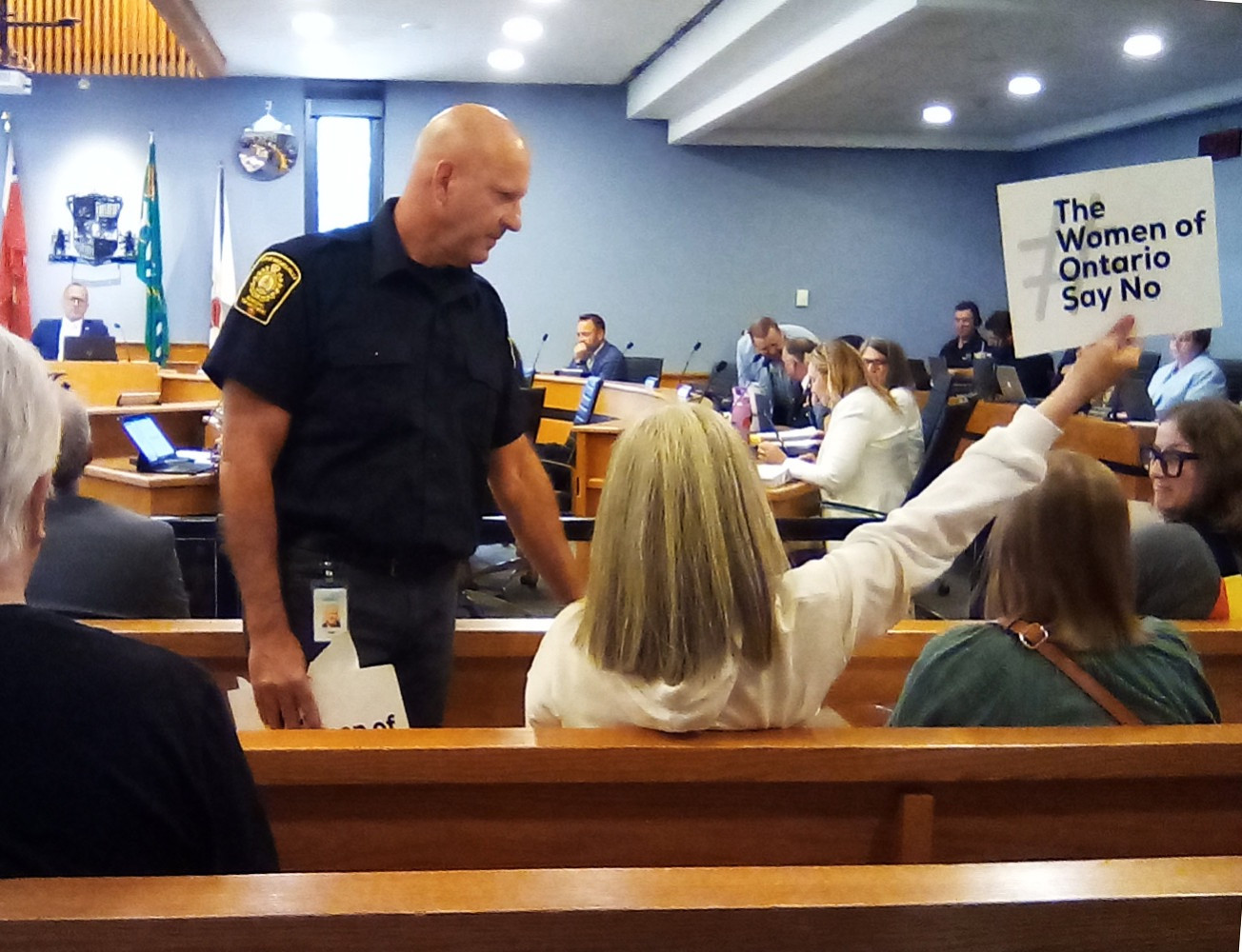 In June, three women were arrested during a council meeting after protesting council's repeated refusal to allow the provincial advocacy group Women of Ontario Say No, led by Emily McIntosh (WOSN), to speak to council regarding proposed changes to Bill 9, an amendment to legislation that calls for stronger accountability measures for elected officials facing criminal allegations, with a focus on those charged with violent crimes.