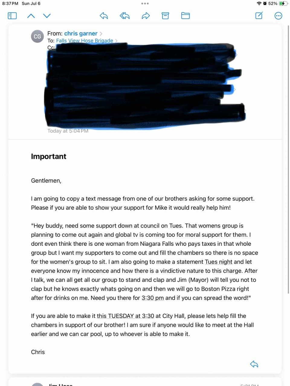 Reporting by The Pointer revealed that, behind the scenes, Strange was organizing efforts to counter the anticipated presence of advocates at an upcoming council meeting last summer. He encouraged members of his local community group, the Falls View Hose Brigade, to attend and occupy seats in the council chambers “so there is no place for the women’s group to sit.” In the same communication, he encouraged a breach of council decorum, instructing the group to “stand and clap”.