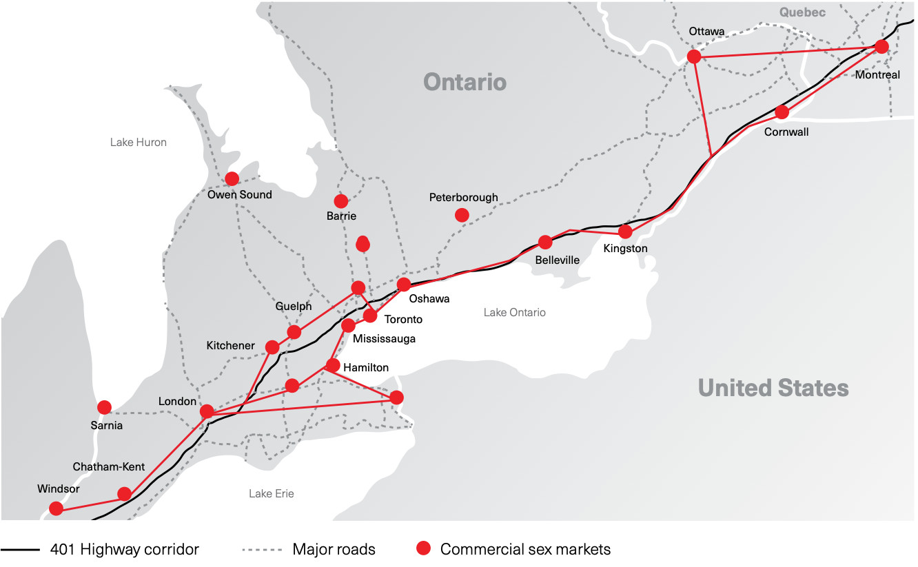 Human traffickers are known to operate along the Highway 401 corridor, capitalizing on the densely populated regions along the route while also allowing them to transport their victims frequently and with ease.