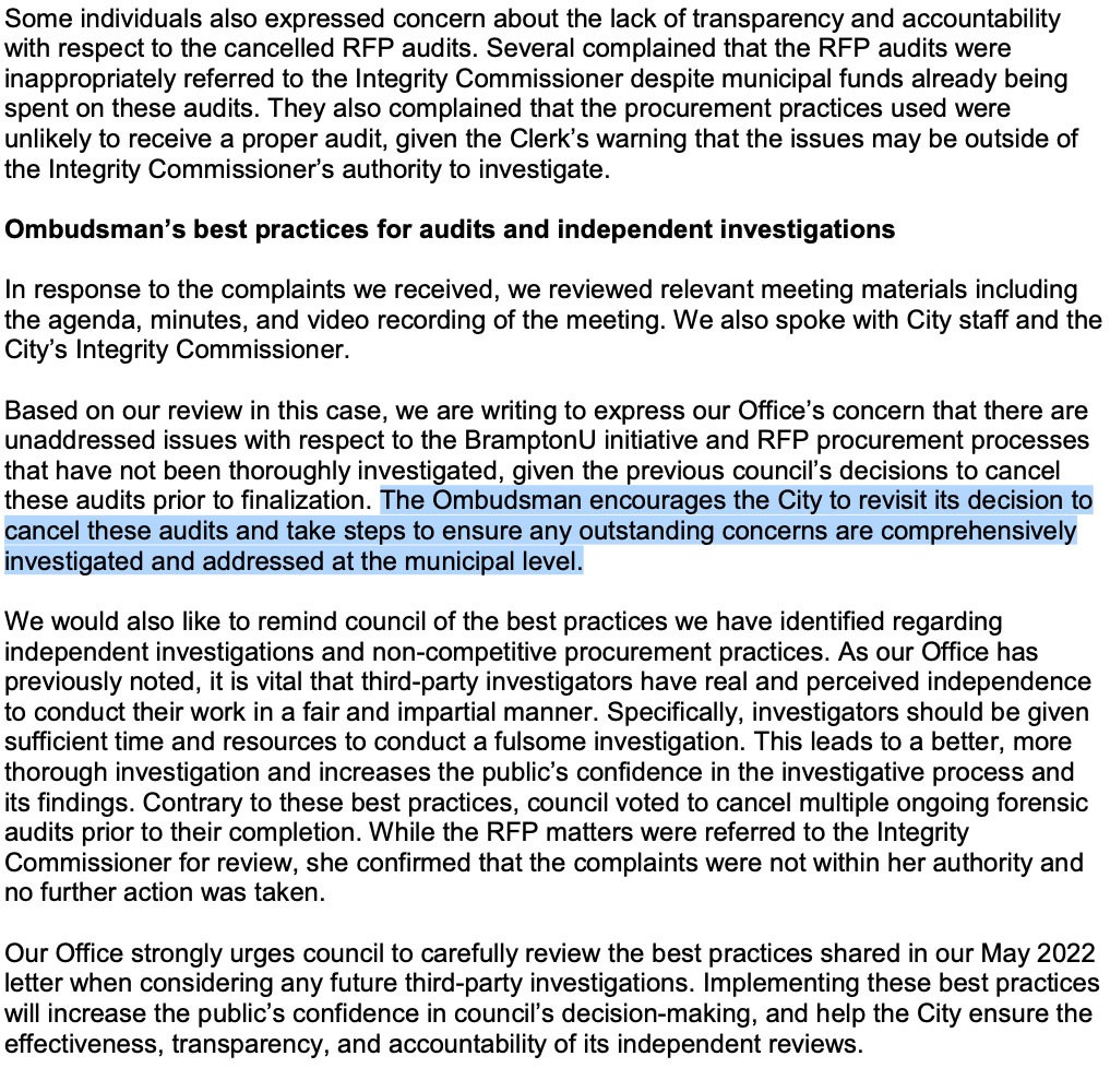 “The Ombudsman encourages the City to revisit its decision to cancel these audits and take steps to ensure any outstanding concerns are comprehensively investigated and addressed at the municipal level,” a May 2023 letter from the province’s top accountability watchdog underscores.