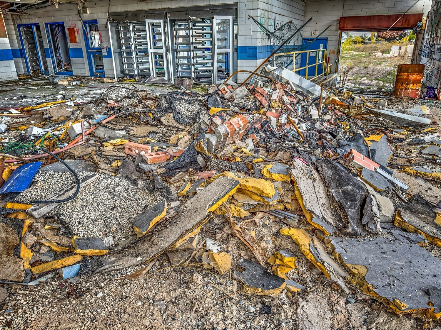Collapsed concrete and exposed underground tunnels beneath the former General Motors site.